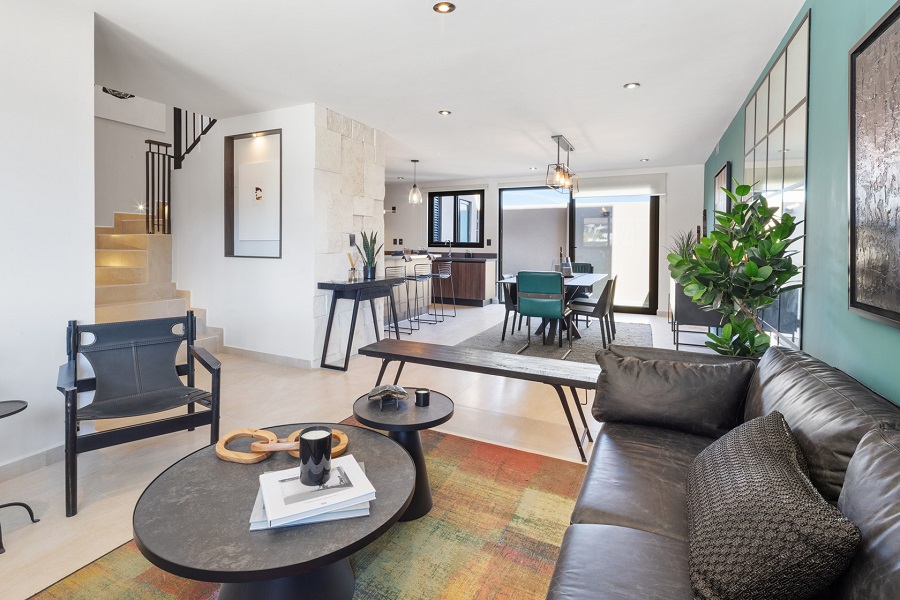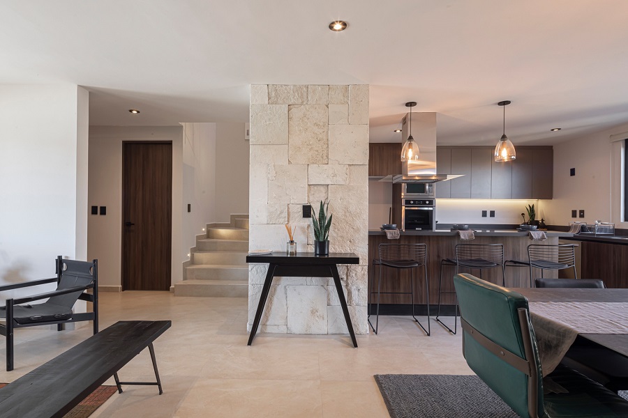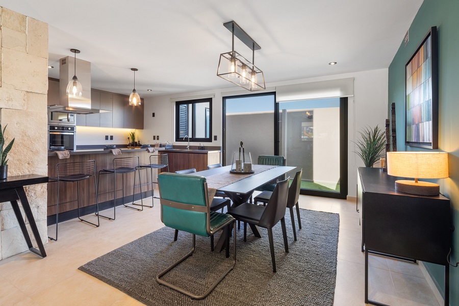 - Sala y comedor abiertos que conectan con el jardín, generando luz natural y un ambiente acogedor.