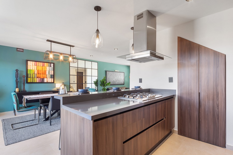- Cocina equipada con barra de servicio, lavavajillas y espacios de almacenamiento.